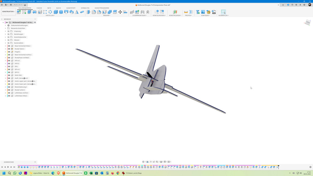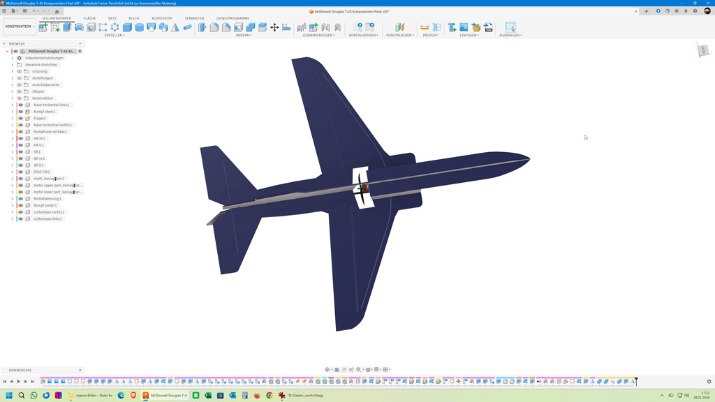 ARES fliegt schön, ist mir aber für unsere Halle fast ein bisschen zu groß. Deswegen habe ich mich daran gesetzt mit Fusion 360 einen ähnlichen, aber etwas kleineren Flieger komplett von Grund auf zu konstruieren. Als Vorlage hat mir eine 3-Seiten-Ansicht einer T-45 Goshawk gedient.