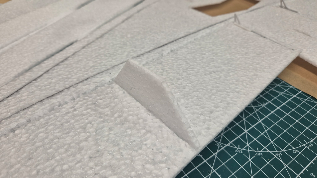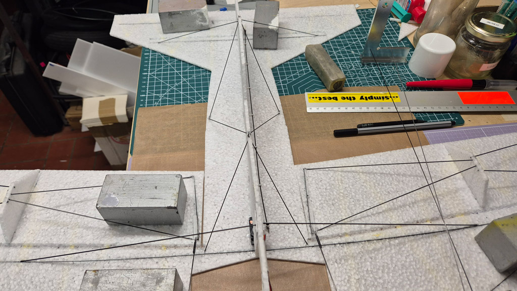 Tragflächenstreben angebracht. Am Rumpf habe ich kleine Verstärkungen aus 0,5mm ABS-Platten angebracht, da die Streben bei meinen anderen Indoor-Modellen immer ausgerissen sind. Mehrgewicht für 4 Verstärkungen knapp 1g. |