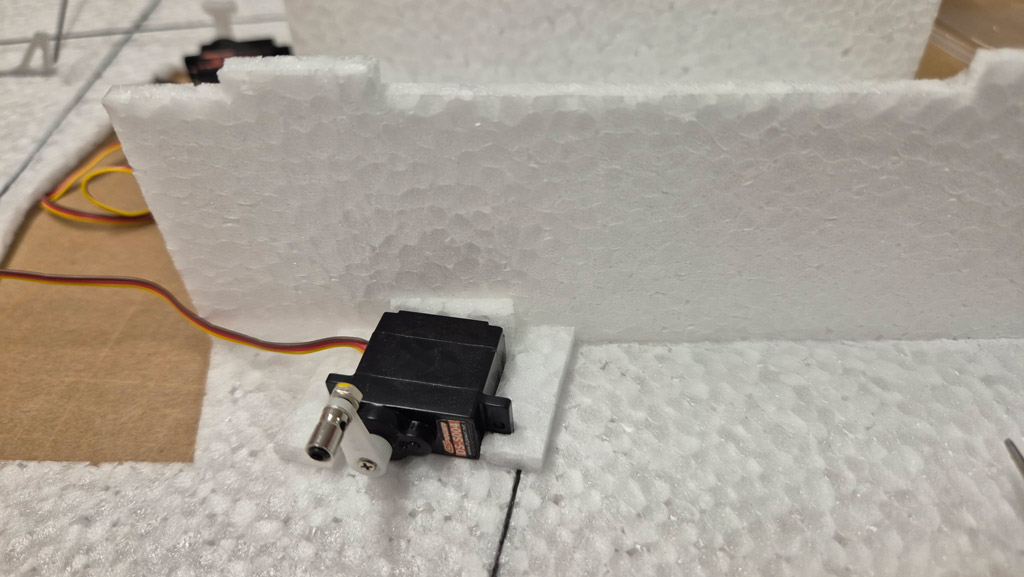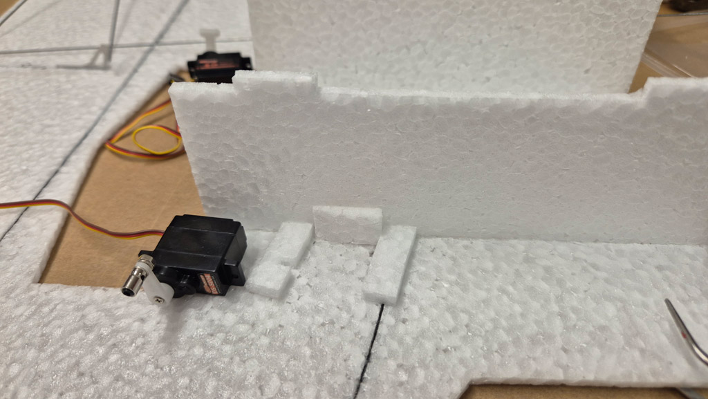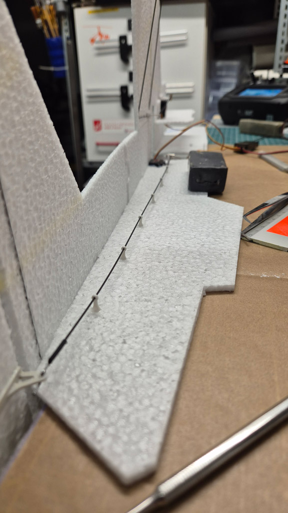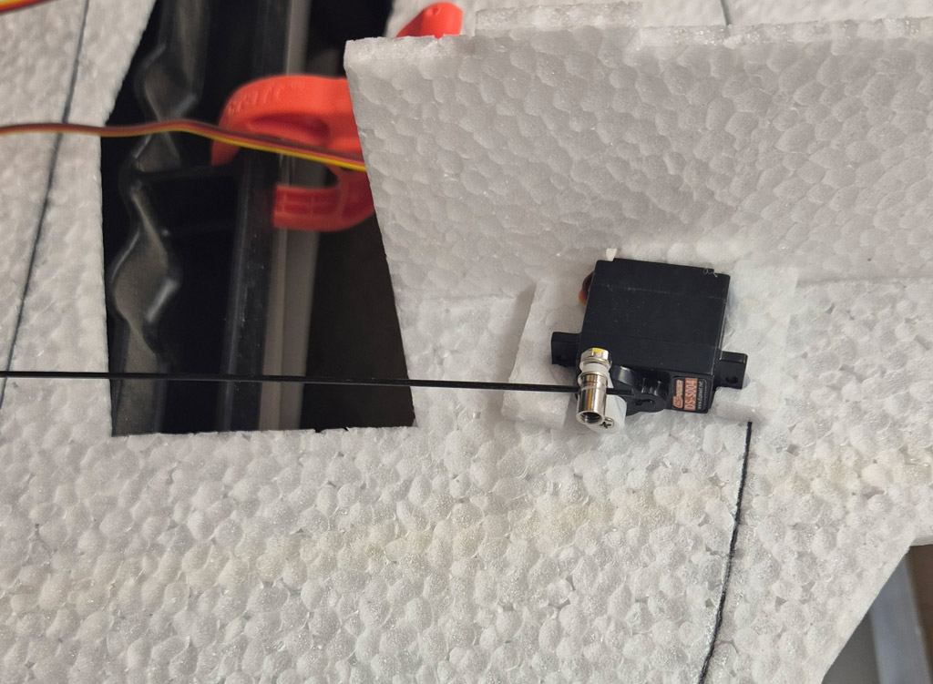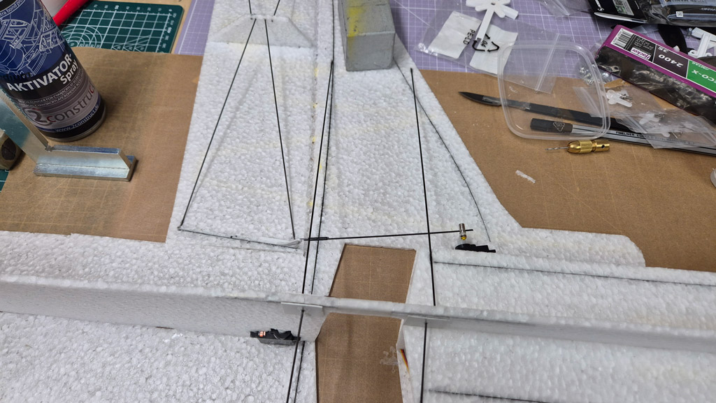 Servokabel verlegt. Dieses mal habe ich die Servokabel nicht durch Kupferlackdraht ersetzt, da sie hier nur sehr kurz sind und die Gewichtsersparnis in keinem Verhältnis zum Aufwand steht. |