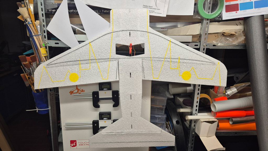 - Die T-45 ist normalerweise ein Tiefdecker. Um die Agilität zu erhöhen, habe ich die Tragfächen angehoben und genau in der Propellerachse positioniert. D.h. mein Flieger ist jetzt ein Mitteldecker. Mal schauen, ob das so hinhaut.