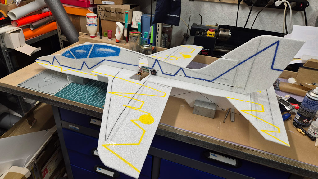 Weiterhin habe ich am Höhenruder den V-Ausschnitt noch nicht gemacht, um mehr Ruderfläche zu haben. Ich denke das lasse ich auch so. Das Seitenruder jedoch werde ich demnächst noch etwas verkleinern, so groß wie im Plan braucht es dann doch nicht zu sein.