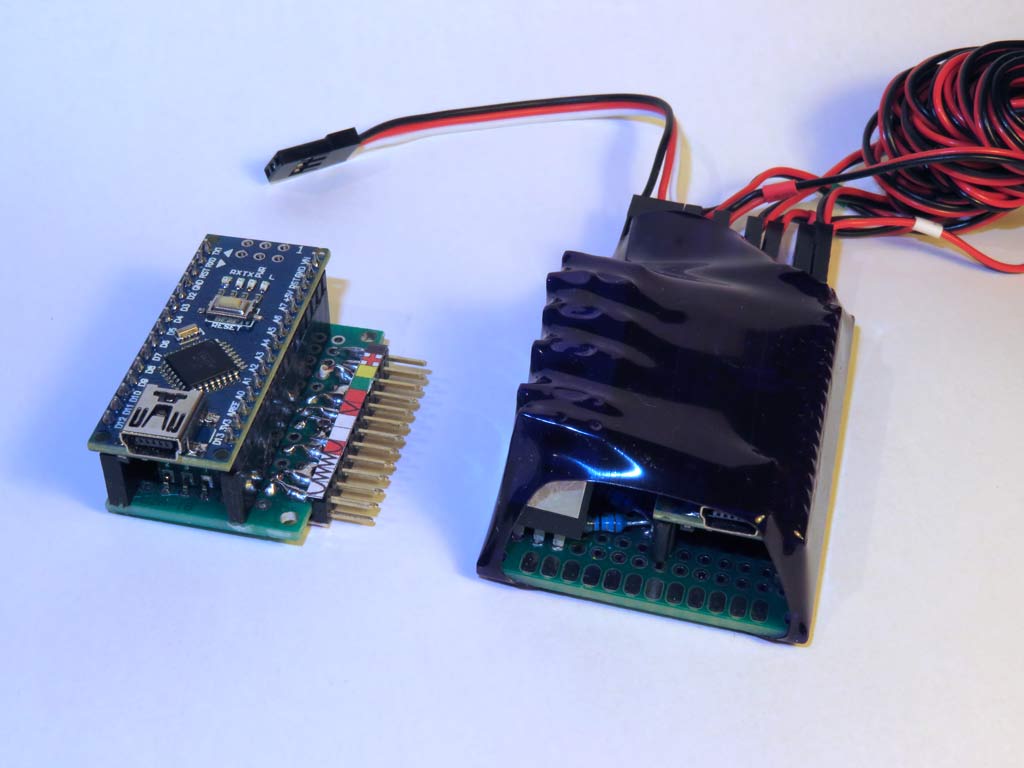 2. Die Mosfets nicht direkt auf die Lochrasterplatine sondern auf kleine Adapterplatinen zu löten. Auf Lochraster passt es nicht so 100%ig und außerdem kann man die Adapterplatinen einfach auslöten, wenn mal ein Mosfet den Geist aufgibt. Aus demselben Grund habe ich auch den Arduino nicht verlötet, sondern in Buchsenleisten gesteckt.