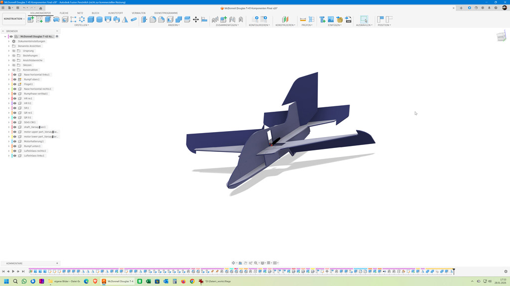 Der ARES fliegt schön, ist mir aber für unsere Halle fast ein bisschen zu groß. Deswegen habe ich mich daran gesetzt mit Fusion 360 einen ähnlichen, aber etwas kleineren Flieger komplett von Grund auf zu konstruieren. Als Vorlage hat mir eine 3-Seiten-Ansicht einer T-45 Goshawk gedient.