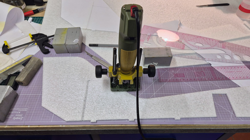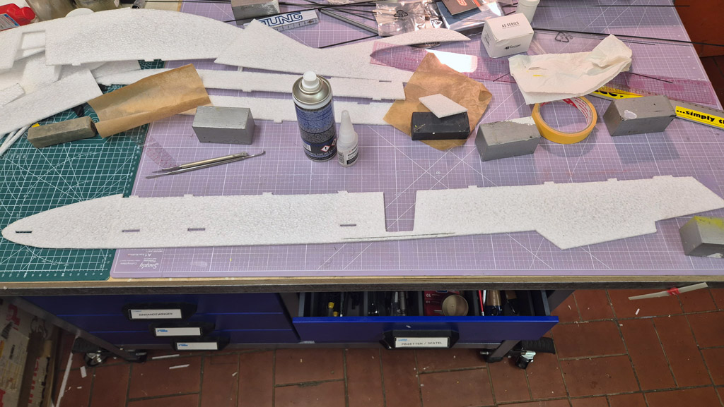 Weiterhin habe ich am Höhenruder den V-Ausschnitt noch nicht gemacht, um mehr Ruderfläche zu haben. Ich denke das lasse ich auch so. Das Seitenruder jedoch werde ich demnächst noch etwas verkleinern, so groß wie im Plan braucht es dann doch nicht zu sein.